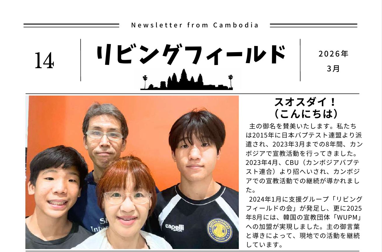 この「リビングフィールドの会」は、嶋田和幸・嶋田薫両宣教師のカンボジアでの宣教活動と、生活を支援する目的で立ち上げました。両宣教師の働きにおいては、カンボジアの地で現地の人々に、復活のキリストにある希望を分かち合うことが、神さまから示された「真の目的」です。