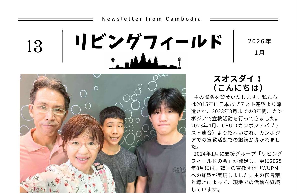 The English version of the newsletter is available for download here. 2025 3/12 お知らせ 以下のリンクをクリックしますと、ニュースレター英語版をダウンロードできます。 Living Field No.1 Sep2023 small sizeダウンロード Living Field No.2 Nov2023 small sizeダウンロード Living Field No.3 Jan2024 small sizeダウンロード Living Field No.4 Mar2024 small sizeダウンロード Living Field No.5 May2024 small sizeダウンロード Living Field No.7 Oct 2024 small sizeダウンロード Living Field No.8 Jan 2025 small sizeダウンロード Living Field No.9 Mar 2025 small sizeダウンロード Living Field No.10 May 2025 small sizeダウンロード Living Field No.11 August 2025 small sizeダウンロード Living Field No.12 October 2025 small sizeダウンロード Livingfield No.13 January 2026 small sizeダウンロード お知らせ ニュースレター「リビングフィールド」バックナンバーはこちらから 世界とつながる-WUPM(世界未伝道部族宣教会)加盟- 関連記事 ニュースレター最新号、2026年1月号が完成しました。 2026年1月22日 2025年9月13日~16日 横浜オンヌリキリスト教会ミッションアウトリーチ 2025年10月8日 8月3日(日)カンボジア宣教報告会動画(常盤台バプテスト教会Youtube) 2025年9月21日 世界とつながる-WUPM(世界未伝道部族宣教会)加盟- 2025年9月11日 ニュースレター「リビングフィールド」バックナンバーはこちらから 2025年1月21日 「希望の糸」新デザイン「アンコールワット」完成しました。 2025年1月21日 宣教ツアーを受け入れています。 2024年12月15日